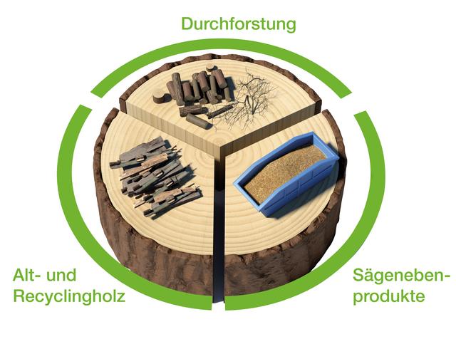 Waste and recycled wood already account for more than 30 % of the wood we use. We purchase these from local specialist firms. An additional 30% is made up of sawmill by-products – i.e. sawdust and wood chips. The remaining wood, as already mentioned, comes from thinning and forest maintenance.